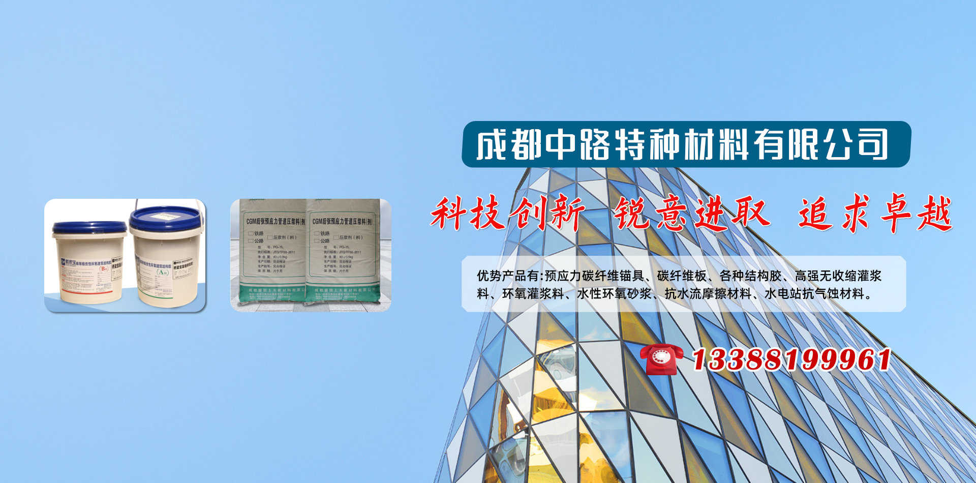 成都中路特種材料有限公司借助清華大學高分子材料學科、晨光化工研究院、西南交通大學、四川交通職業(yè)技術(shù)學院科研技術(shù)平臺成為一家集新材料研發(fā)、銷售、技術(shù)服務和施工于一體的專業(yè)服務公司,優(yōu)勢產(chǎn)品有:預應力碳纖維錨具、碳纖維板、各種結(jié)構(gòu)膠、高強無收縮灌漿料、環(huán)氧灌漿料、水性環(huán)氧砂漿、抗水流摩擦材料、水電站抗氣蝕材料和研發(fā)各種特殊用途膠黏劑產(chǎn)品地處西南腹地成都,業(yè)務覆蓋四川各大中小城市、重慶、云南、昆明、新疆、西藏等區(qū)域。產(chǎn)品涵蓋各種加固施工材料、施工設(shè)備及施工配件,品牌有威士邦等aa進口品牌,同時批發(fā)銷售國產(chǎn)高、中、低端品牌,為客戶提供全面參考。 成都中路特種材料有限公司為您提供加固行業(yè)的一站式服務! 如果您面對建筑物加固,不知如何下手,我們將針對您的項目情況,提供全面的技術(shù)指導咨詢,甚至為您量身定做加固方案;如果您面對項目要求,不知如何購買加固材料,我們將根據(jù)您的需要,提供多種參考,從進口品牌、國內(nèi)知名品牌到低端產(chǎn)品,一應俱全; 如果你萬事俱備,不知何處尋找施工人員,我們可以為您提供具有多年加固經(jīng)驗的專業(yè)隊伍;中路特種材料致力于為客戶提供全方位的建筑物加固解決方案。 成都中路特種材料有限公司是一座橋,一座連接廠家與用戶的橋,以質(zhì)量求生存,以信譽圖發(fā)展,成都中路特種材料有限公司期望用真摯的服務筑起一座客戶信任之橋。   科技創(chuàng)新 銳意進取 追求卓越!        熱忱歡迎業(yè)內(nèi)專業(yè)人士加盟合作!